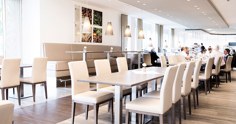Die gemütliche Cafeteria des Klinikum Lippstadt Wiedenbrücker Straße liegt im Erdgeschoss des Haupthauses. Durch die Panoramafenster eröffnet sich der Blick in unseren kleinen Park mit seinem alten Baumbestand. Bei gutem Wetter ist unsere Terrasse geöffnet.