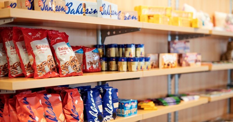 - Süße und salzige Snacks, Eis, Getränke, Zeitschriften und Bücher