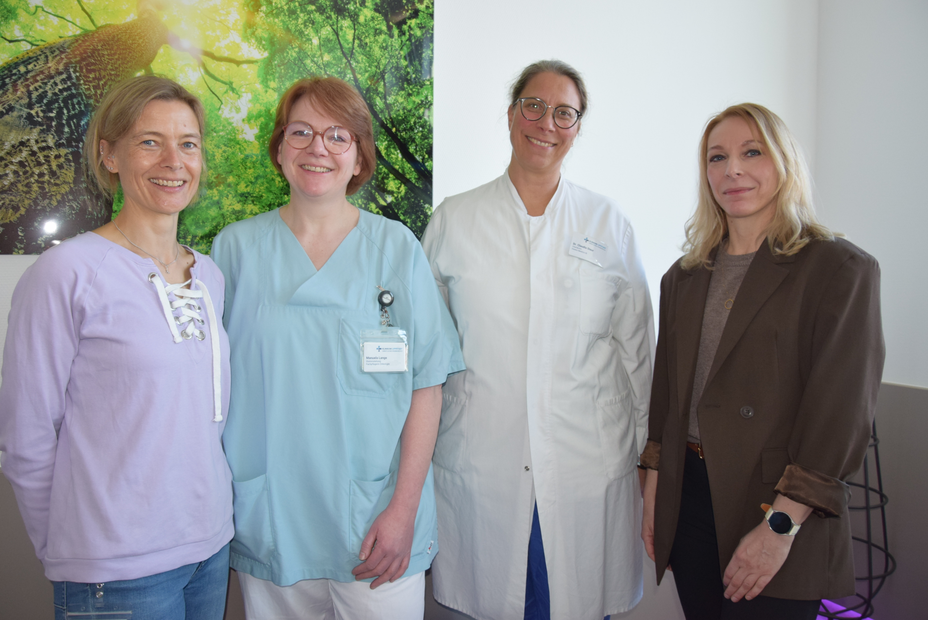 BU: Erfahrenes Team für onkologische Patienten des Klinikums Lippstadt: Nach der Zentralisierung der Klinik für Hämatologie, Onkologie und Palliativmedizin am Standort Klosterstraße liegt die medizinische Leitung weiterhin bei Chefärztin Dr. Claudia Steur (2. v. r.). Stellvertretend für das Pflegeteam: Elisabeth Meschede (1. v. l.) als stellvertretende Stationsleitung, sowie die Stationsleitungen Manuela Lange (2. v. l.) und Monika Alcock (r.).