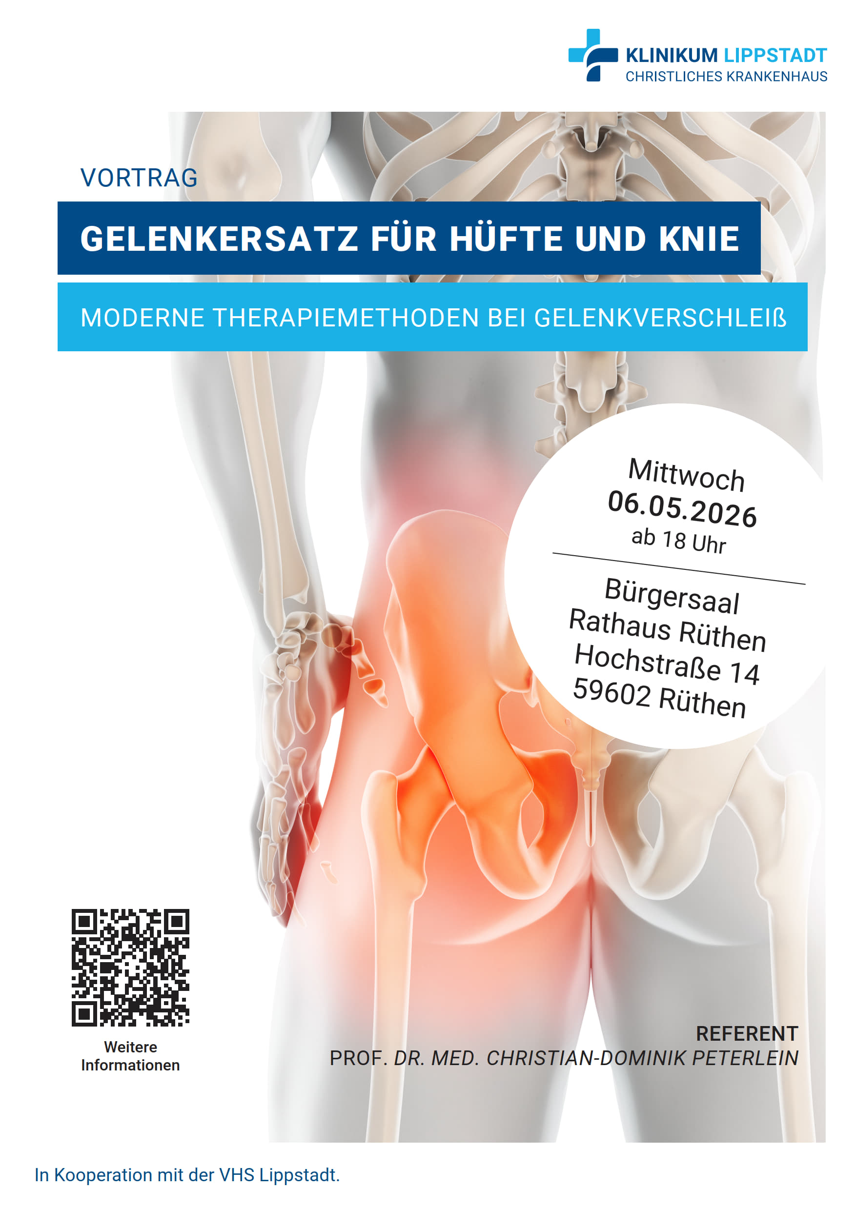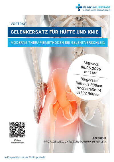 Antworten auf diese Fragen gibt Prof. Dr. med. Christian-Dominik Peterlein, Chefarzt der Orthopädie am Klinikum Lippstadt, in seinem Vortrag „Verschleiß an Hüfte und Knie – Wann ist ein Gelenkersatz erforderlich?“.