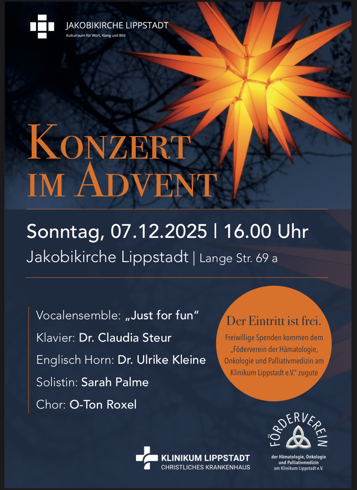 Der Förderverein der Hämatologie, Onkologie und Palliativmedizin des Klinikum Lippstadt e.V. lädt auch in diesem Jahr wieder zum Benefiz-Konzert im Advent ein. Erstmalig findet das Konzert in der Jakobikirche Lippstadt statt - wieder unter der Leitung von Dr. Claudia Steur, Chefärztin im Klinikum Lippstadt.
