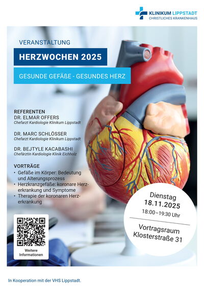 Die Koronare Herzkrankheit und der Herzinfarkt stehen in diesem Jahr im Mittelpunkt der Herzwochen der Deutschen Herzstiftung. Unter dem Titel „Gesunde Gefäße – gesundes Herz“ veranstaltet das Klinikum Lippstadt in Zusammenarbeit mit der Klinik Eichholz einen Vortragsabend.